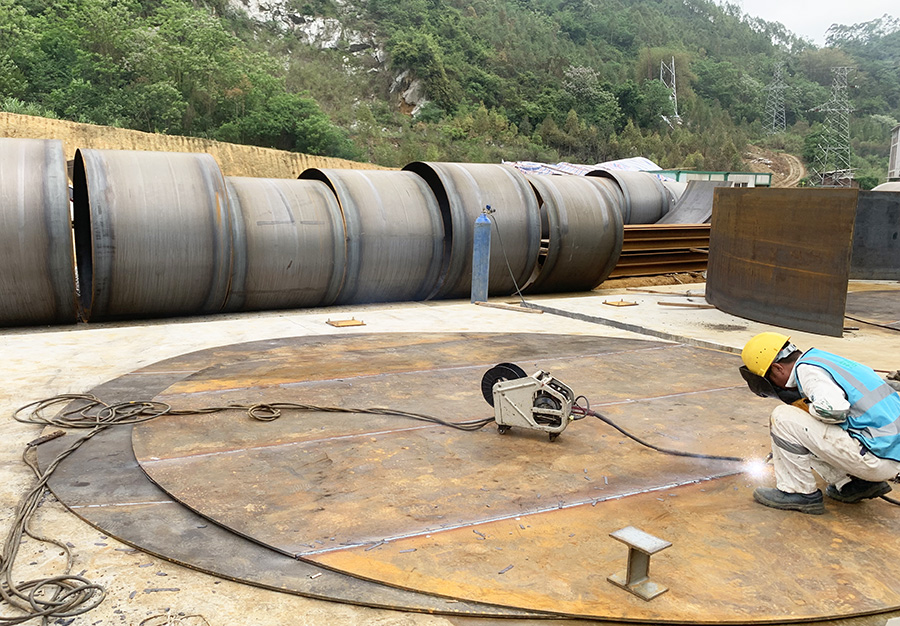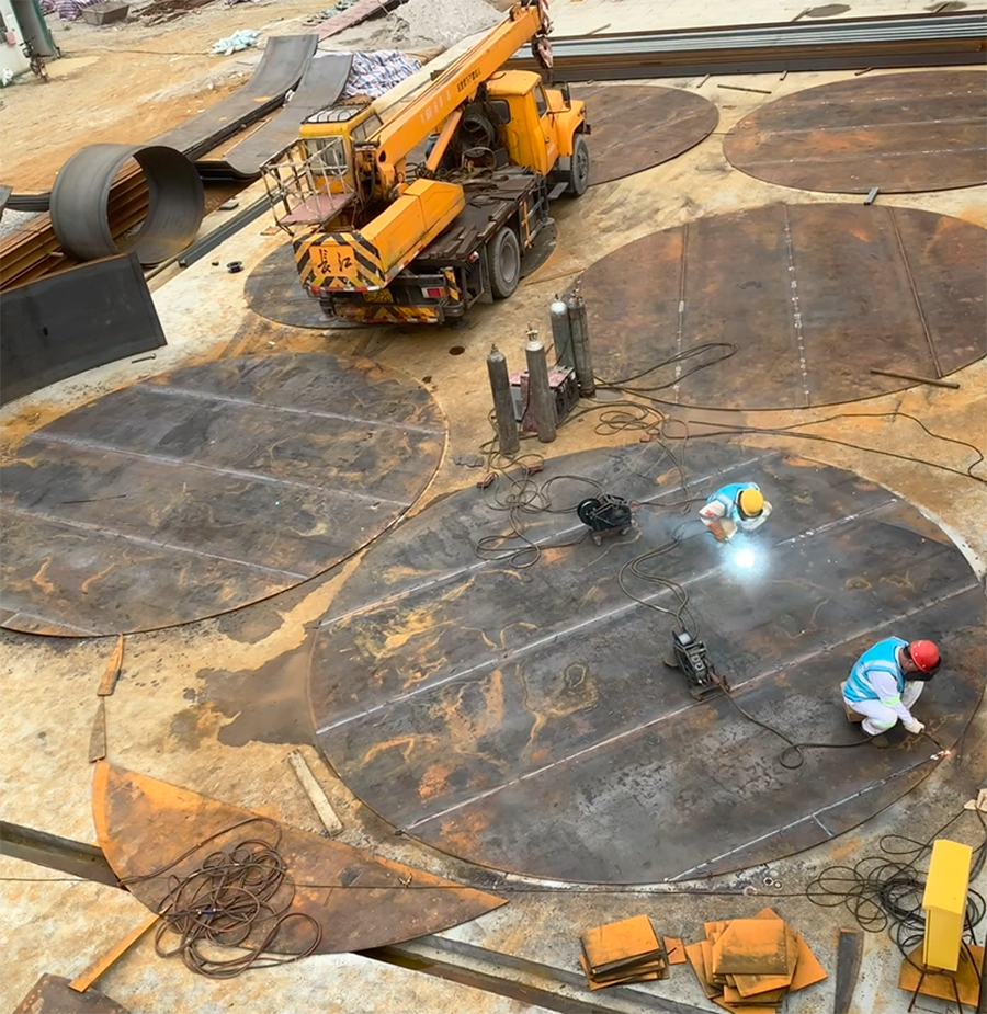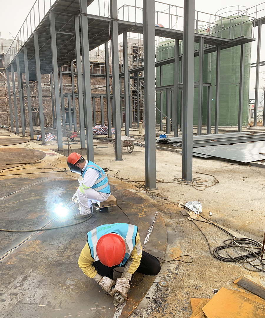 燒焊環(huán)節(jié)的工藝,無法在雨水天氣進行,但是又不能耽誤工期,施工隊長想出辦法,一邊用火槍烤干鋼材,一邊焊接進行,同步進行。